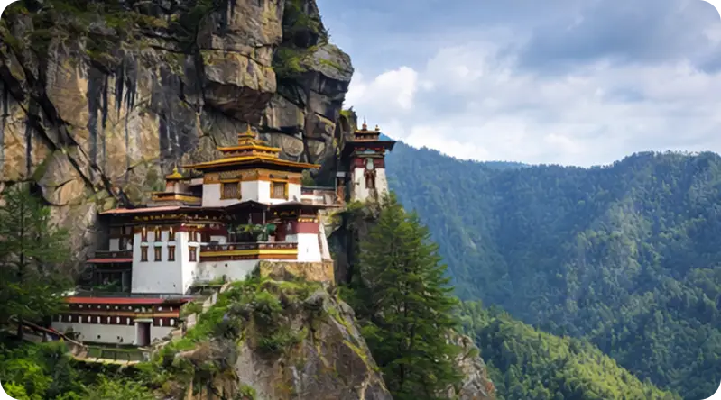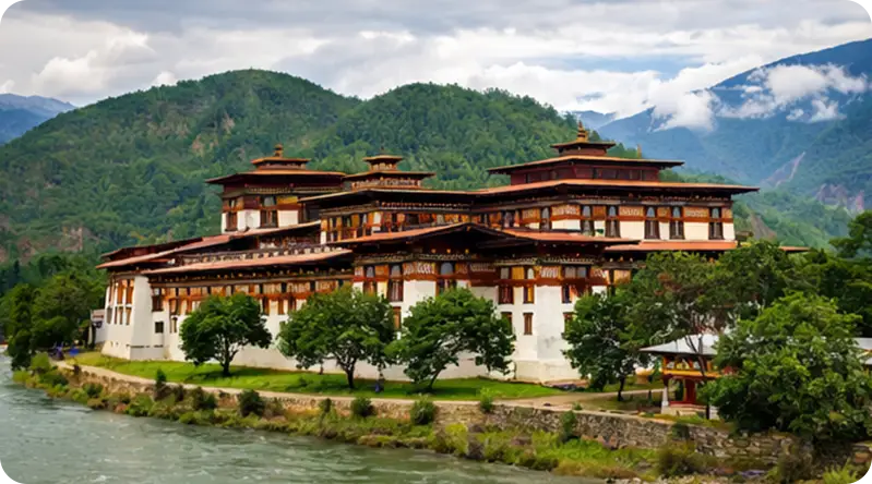 Nestled in the eastern Himalayas, Bhutan features majestic mountains, pristine forests, and rich biodiversity, maintaining strong environmental protections and carbon-negative status to preserve its natural heritage for future generations.
